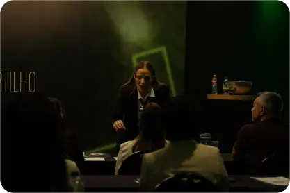 É um campo de treino. Durante dois dias intensos, você vai trabalhar sua comunicação na prática. Entendendo como postura, expressão, presença e linguagem corporal influenciam diretamente a forma como as pessoas percebem você. Cada gesto, cada palavra e cada silêncio comunicam algo. E quando você aprende a dominar esses sinais, sua presença muda completamente.